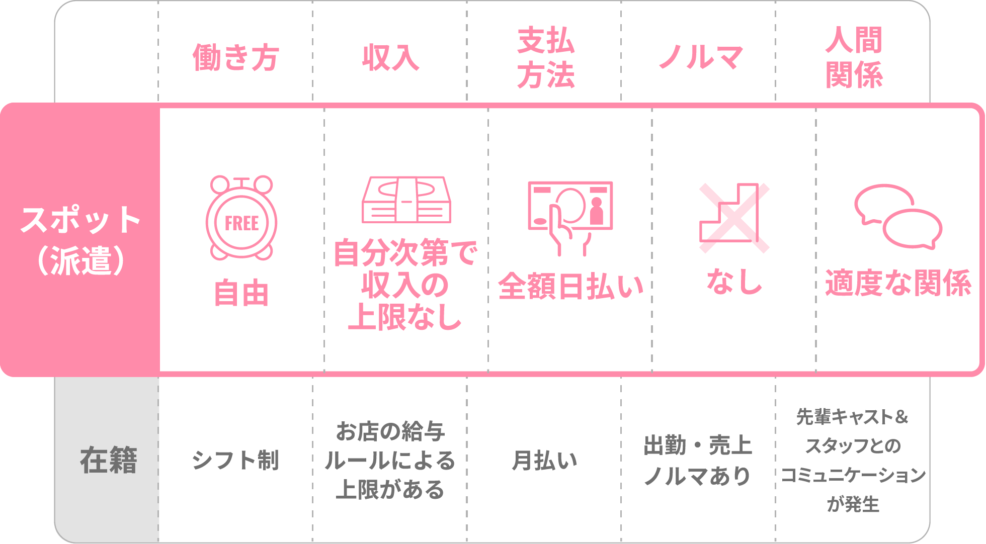 在籍で働く時にありがちな給料未払い、遅刻などによるペナルティの心配もありません。その日の出勤終わりに全額日払いで給料を受け取れます。